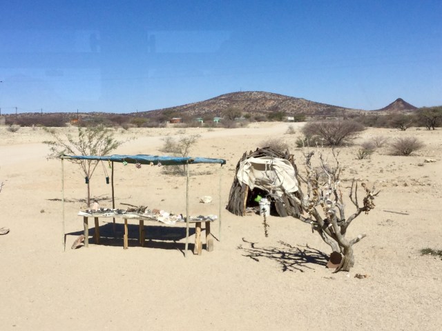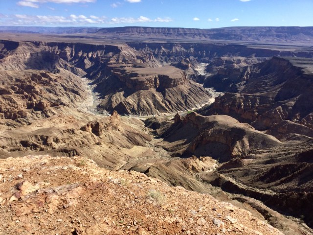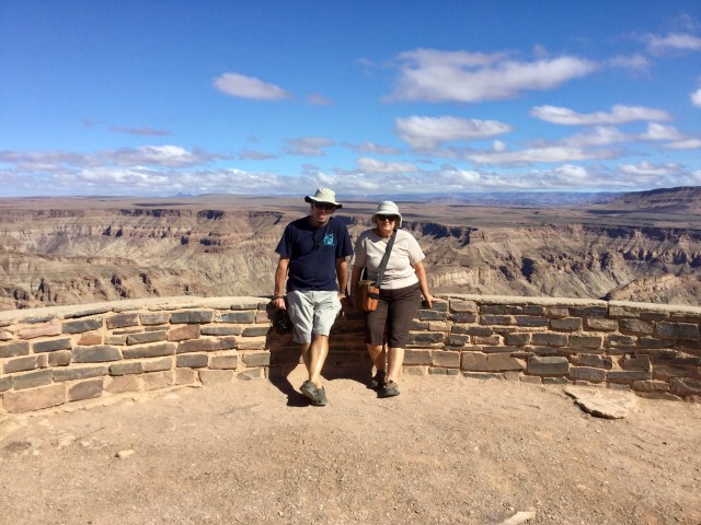 We crossed into Namibia yesterday, and I have never seen such a dry, desolate place! It is so arid, rocky and sandy. Just over two million people live here. We were driving along, thinking there’s nothing here…and out of nowhere a vineyard appears to break up the landscape. Our first stop was the Orange river, which forms the border with South Africa. We stayed in a cabana overlooking the river, which is popular with canoe enthusiasts. Today we travelled on to the Fish River Canyon, the second largest in the world after the Grand. Spectacular! We are on a private tour at the moment…just Lionel and I, with Anneke our translator, our guide and driver – Kobus, and our chef – Honori…we are picking up some more people in a week…but at the moment it is just us and the truck! What personalised service! The resort we stayed at had thermal pools, $2 pints and an indoor spa…wedged in between two rocky hills. Cheeky baboons wandered along our balcony this morning…looking for any loose bits of food…which they found from various sources!