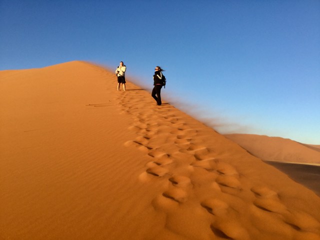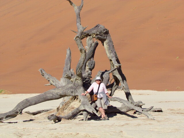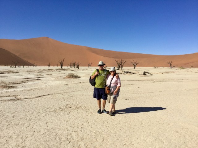 Today we were up and at the Namib Naukluft National Park gate at 6am. This was so we could climb the sand dune before it got too hot. What was I thinking? Well, it was windy this morning…that added to the adventure. I only climbed about a quarter, and then asked myself what was I trying to prove? Worse than trudging over soft sand on the beach! Each time I stopped, the sand whipped over me…oh no, just like in Lawrence of Arabia, would I be covered? Never to be seen again! Lionel kept climbing, but I gave up fairly quickly and contentedly took pictures of him from the base. We also travelled to Deadvlei and Sossusvlei, one a past and one a present oasis…no water about, it was large clay pan. Very stark, and gorgeous dead trees. Our last stop was at Seisram Canyon, where we walked through and climbed over crumbling rocks. Almost winter in the desert and I’m about to go for a swim!