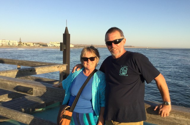 What an amazing day we have had in Swakopmund! We started out on quad bikes and rode for an hour in the sand dunes…only got bogged about five times! It was exhausting, concentrating on revving, turning and avoiding soft sand. I kept thinking about “Lawrence of Arabia”…would they rescue me in time if I fell into a hole? Then we stopped in the middle of the ride and went for a slide down a dune on a piece of masonite. That would have been great to do again if someone had dragged me back up to the top of the hill!! We were covered in a fine layer of sand by the time we returned. Tick that one off a no need to repeat list! In the afternoon we headed into town to see the Kuska Festival. A very German event, held once a year. By the time we arrived it was in full swing, lots of singing, dancing and of course drinking! Everyone was having a fine old time, and we had no idea what was going on! But the young girls invited me up to dance and we all had a good laugh. Just before sundown we made our way out to the pier and enjoyed a few drinks as the sun set over the Atlantic Ocean. Ended our day at a pub, where there were huge servings of meat being consumed by the still celebrating Kuska crowd!
