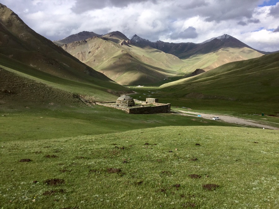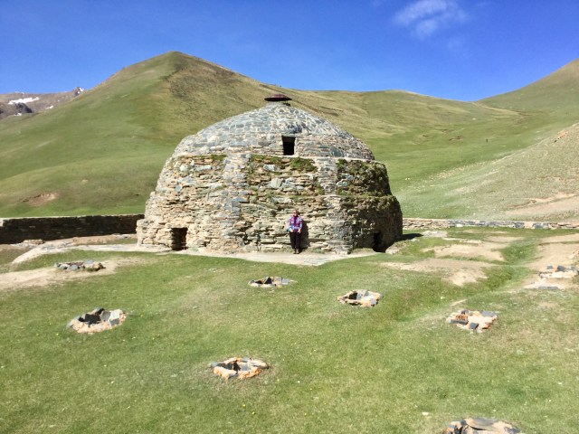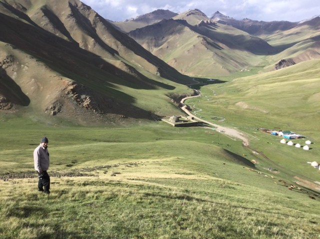 As soon as I saw Tash Rabat in a photo, I knew we had to get there. It was a caravanserais on the old silk route from China, as well as a monastery at some stage. Driving through the mountain pass, and arriving at the yurt camp nearby was just wonderful. We watched the goats clambering over the foothills and tried to do the same…every step needed concentration, but the view from above was splendid. I just can’t get enough of these mountains! Covered in snow and it’s Summertime. We watched a couple parasail off the opposite hillside, saw the moon rising at 9pm ( still daylight) and chatted with a friendly Singaporean and a French couple over dinner. I still can’t believe we are here!