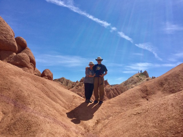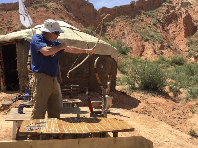 We spent the morning wandering around Fairytale Canyon, a very colourful place with wonderful rock formations not far from Bokonbaevo. We didn’t feel the need to pose on the highest peaks, nor climb precariously up steep slopes for a perfect selfie, but the patterns and colours in nature are just beautiful and well worth a visit. A dog wandered around with us, magpies kept swooping at him, but he didn’t care. Lionel and Kubat also had a go at archery…this young man had set up a yurt for the Summer and had an official guide tag.