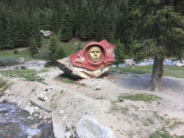 Next stop was Barskoon Waterfall, quite small, but in a fantastic setting amidst snow-covered mountains. There were also two large head sculptures of Yuri Gagarin nearby.