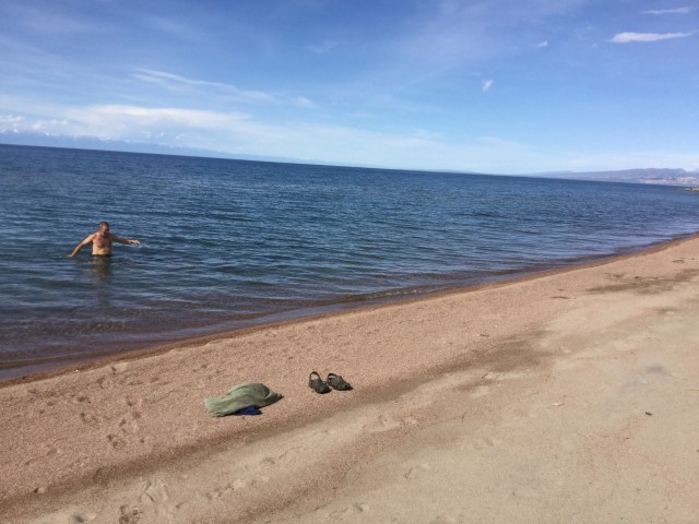 Last activity for the day was a swim in Lake Issyk. A bit cool for me, but Lionel said it wasn’t as cold as the Black Sea in Turkey!