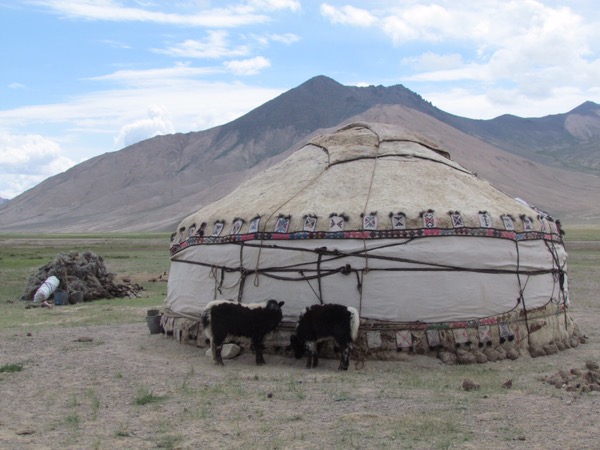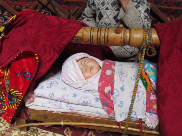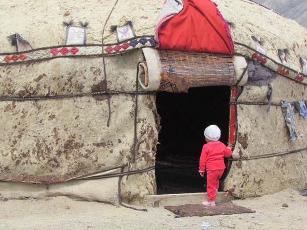 This morning the lake reflected the mountains magnificently, so a quick photo and back into the car. On the way to Murghab we stopped to visit Daniyar’s sister in law, who lived in a yurt village. Once again we were overwhelmed by the hospitality of the people, who prepared bread, biscuits, yak butter, yogurt and the delicious cream. (There were also lots of chocolates on the plate, which the boys grabbed as soon as we left!) I asked about school, but no they don’t go. Another surprise was the baby in the cradle. I thought it was a small covered chest, but then the boys started rocking it. When we lifted the cover there was the baby, swaddled and sound asleep!