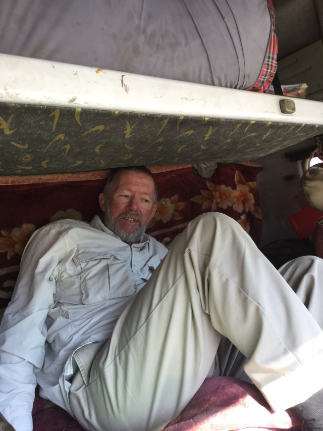 The first Kyrgyz checkpoint was a small carriage, brightly painted at a bend in the road. The next one was where we were dropped by our driver, who had arranged for a truck driver to take us 7km to the first of many Chinese border checkpoints. What an experience that was! I could only just climb into his truck, and Lionel was stretched out behind me in the sleeping area. The truck was overflowing with stuff. Watermelons, water bottles, bags of cucumbers, bread, apricots and pots of I don’t know what. The driver was very jolly, as we approached the border he started moving supplies into the container. Jams, sweets, cosmetics and medical supplies were all passed down to him.