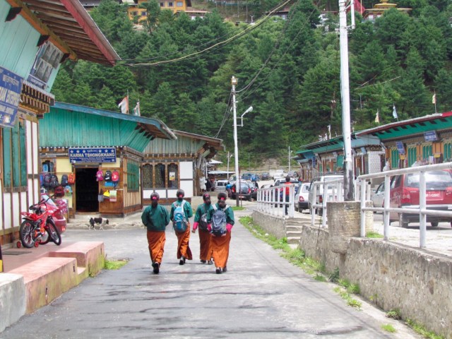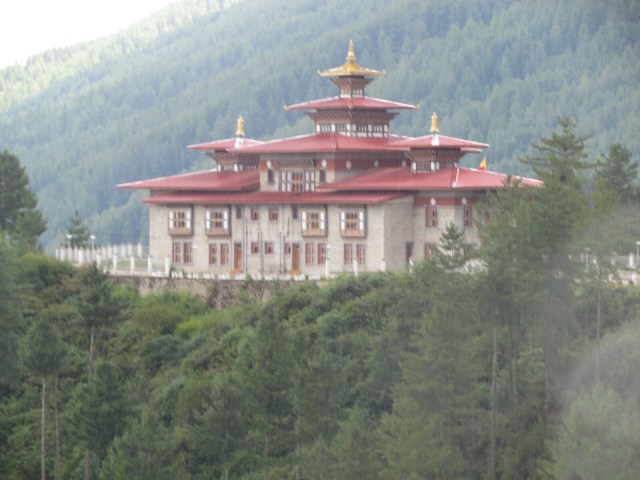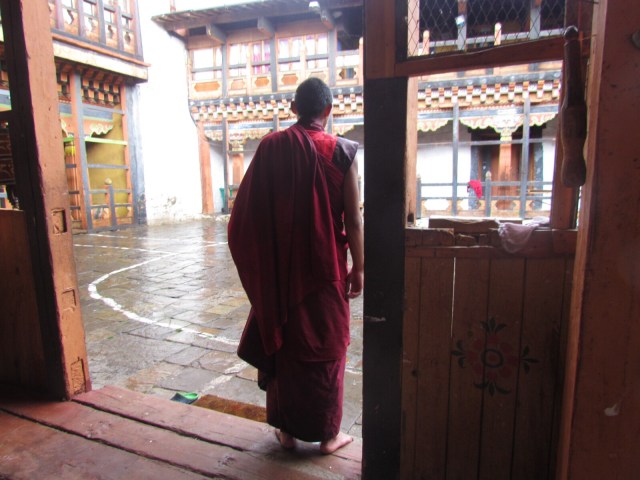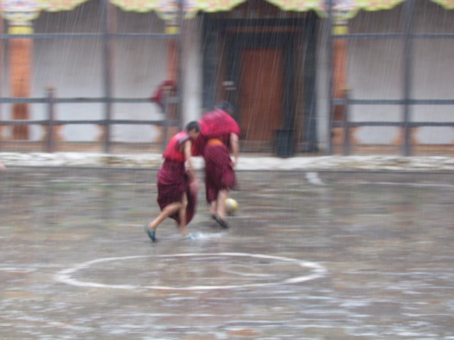 After wandering around town to find somewhere to eat, we found a taxi driver who spoke English to take us to the Dzong. It was raining as we puffed and panted our way up the hill. Four young monks were playing soccer in the rain, which was fun to watch. We also visited their temple which was very serene.