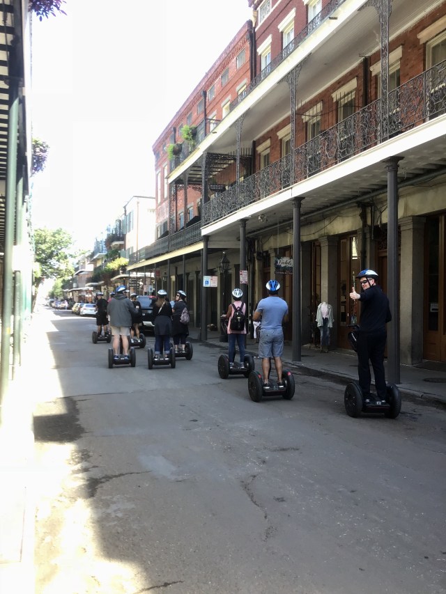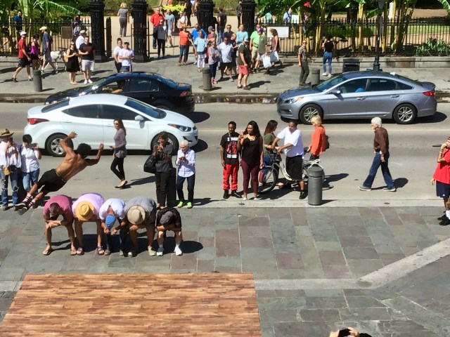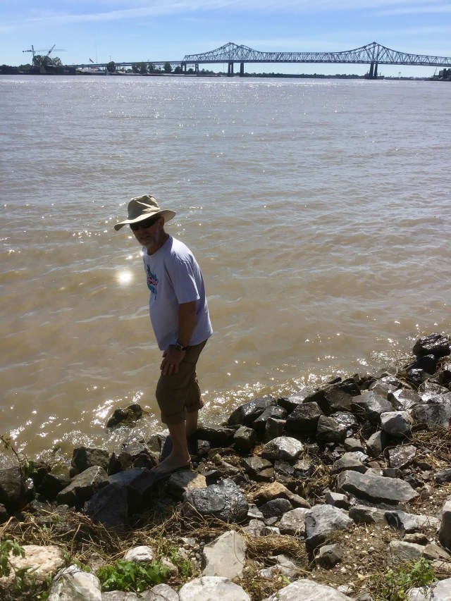 Yesterday we walked along Canal St, down to the Mississippi River. There were people everywhere, wandering about and just hanging out. Lionel dipped his toe in, so that’s another great river ticked off! There were performers/buskers drawing large crowds, and as we neared the French Quarter the crowds grew thicker. We stopped at Jackson Square and headed down Bourbon St, looking for scenes from “Live and Let die” (007).
