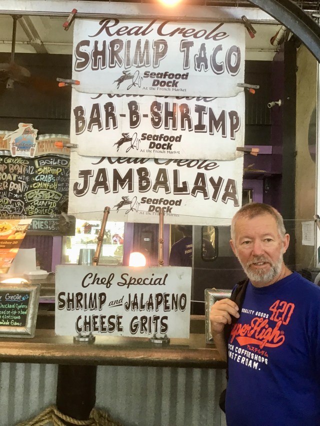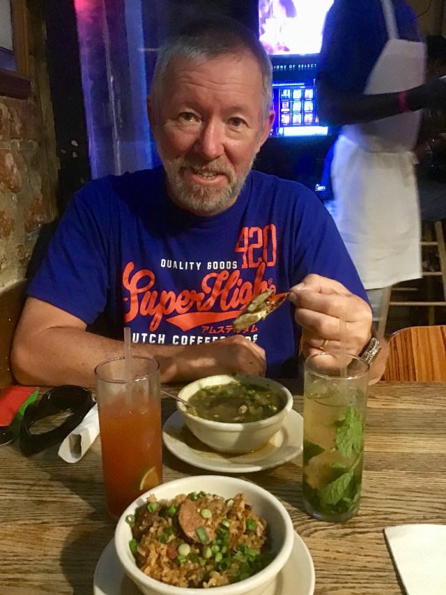 After a couple of hours, we caught the trolley bus back to the French Market. We were starting to get hungry…it was 12:30…and we hadn’t had any breakfast! So we found Coop’s Cafe, which had been recommended as having the best gumbo and jambalaya in town. We really liked the jambalaya…rabbit and sausage, but the gumbo wasn’t that exciting! The mint julep and Bloody Mary were pretty good too!