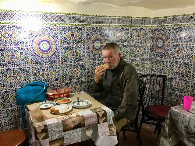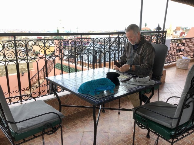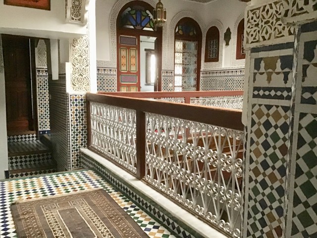 We stayed at Dar Meknes Tresor, a magnificently renovated family home, that has only been in the hotel business for a couple of weeks. Downstairs, the original wooden beams and decorations have been retained, while the upper levels have all been refurbished in a traditional style. We had a room at the top of the stairs, which was close to the rooftop, where you could sit and gaze across to other interesting parts of the town.