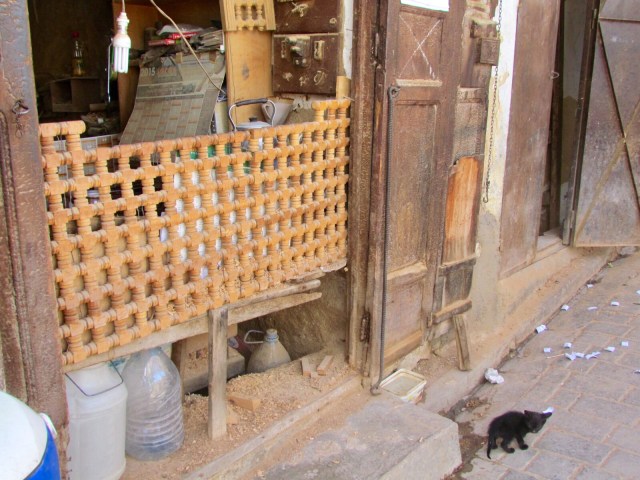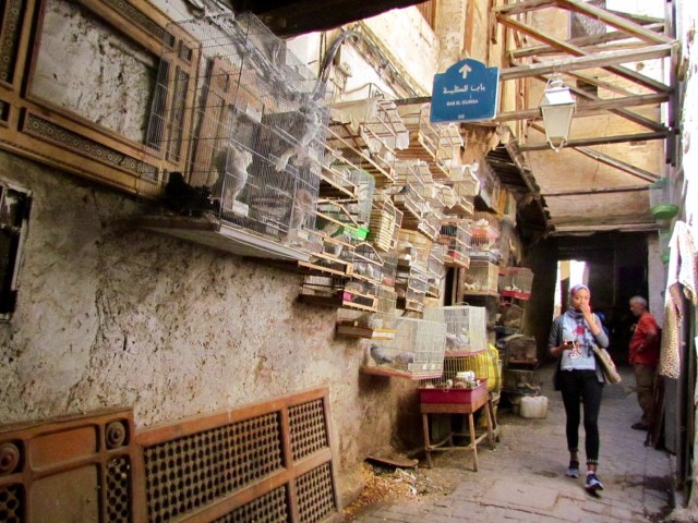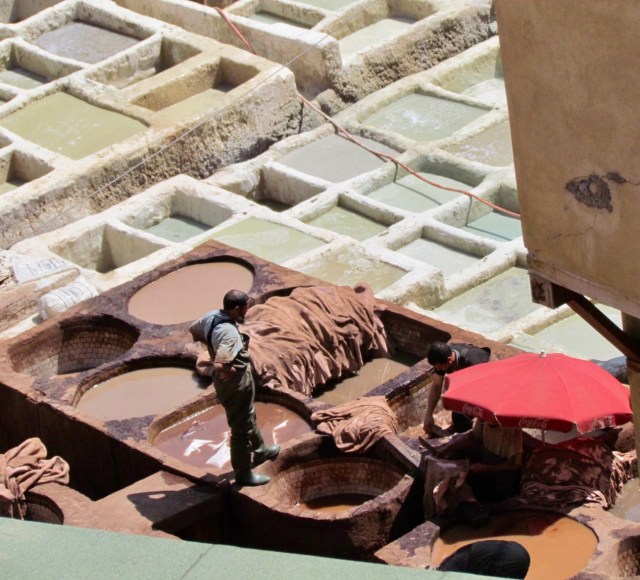 The tanneries were a bit of a disappointment, mostly because of the number of people shuffling through the narrow streets to get the best view. Ours wasn’t the best view, but it still gave us an idea of the process. The stream running by looked polluted, but the shopkeeper assured us the lime was cleaning the river…but there are no fish anymore!