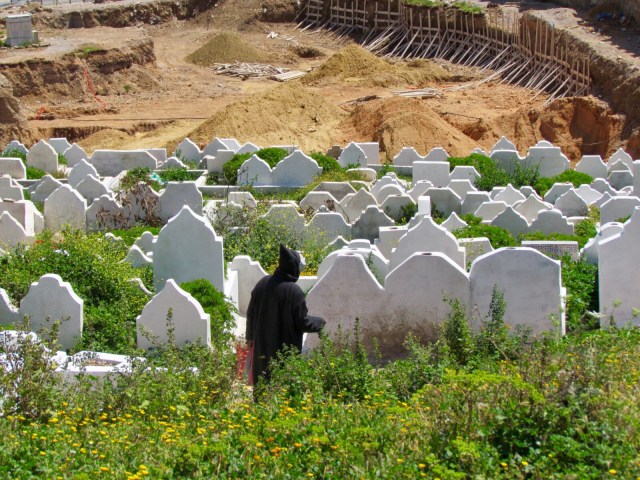 We had had enough of the Medina, so walked on the outskirts of the old town, and climbed up through the cemetery to an old part of the wall. This gave us a fabulous view of the city, and an added bonus was that locals were drying their leather skins on the hillside.