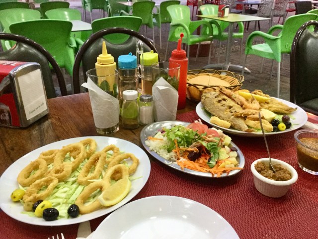 We have had some seafood here, mostly fried fish, calamari, prawns. Beer and wine have also been available, so we enjoyed a drink or three!
