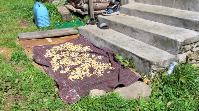 Every inch of ground around their cottage is put to use, nothing is wasted. They are preparing for Winter, by drying vegetables, notably chillies, mushrooms, small chokoes and pumpkin. There are lots of baskets full of chokoes!