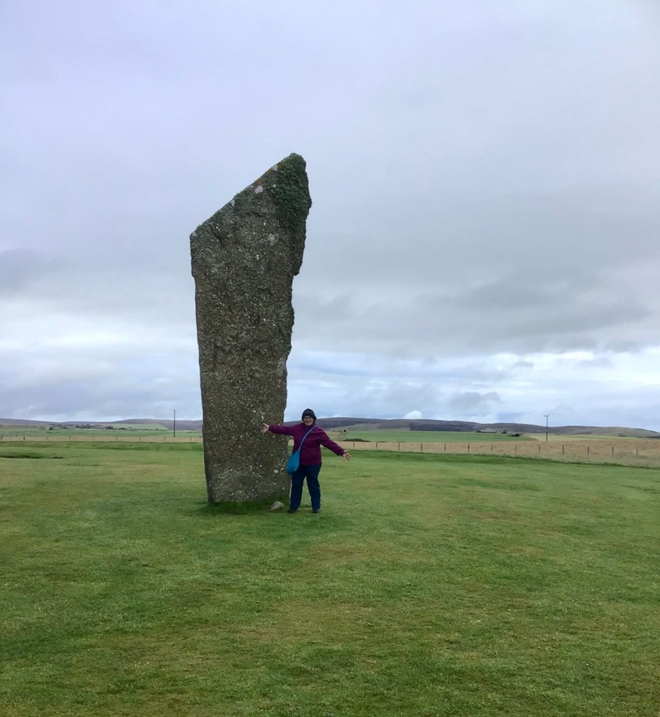 After a warming shower, we headed for the Ring of Brodgar. I had seen the diggings at the Ness of Brodgar on TV. Amazing how tv cameras can make an area look bigger than it is! It started pouring as we reached the car park, so we had a quick look (at the mostly tyre covered site) and then moved on to the Ring. We also stopped at the Stones of Stennes, where you could actually get up close and personal. Most impressive. I loved it.