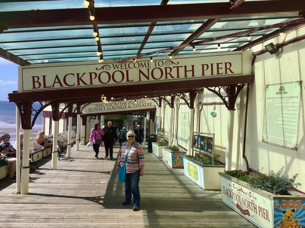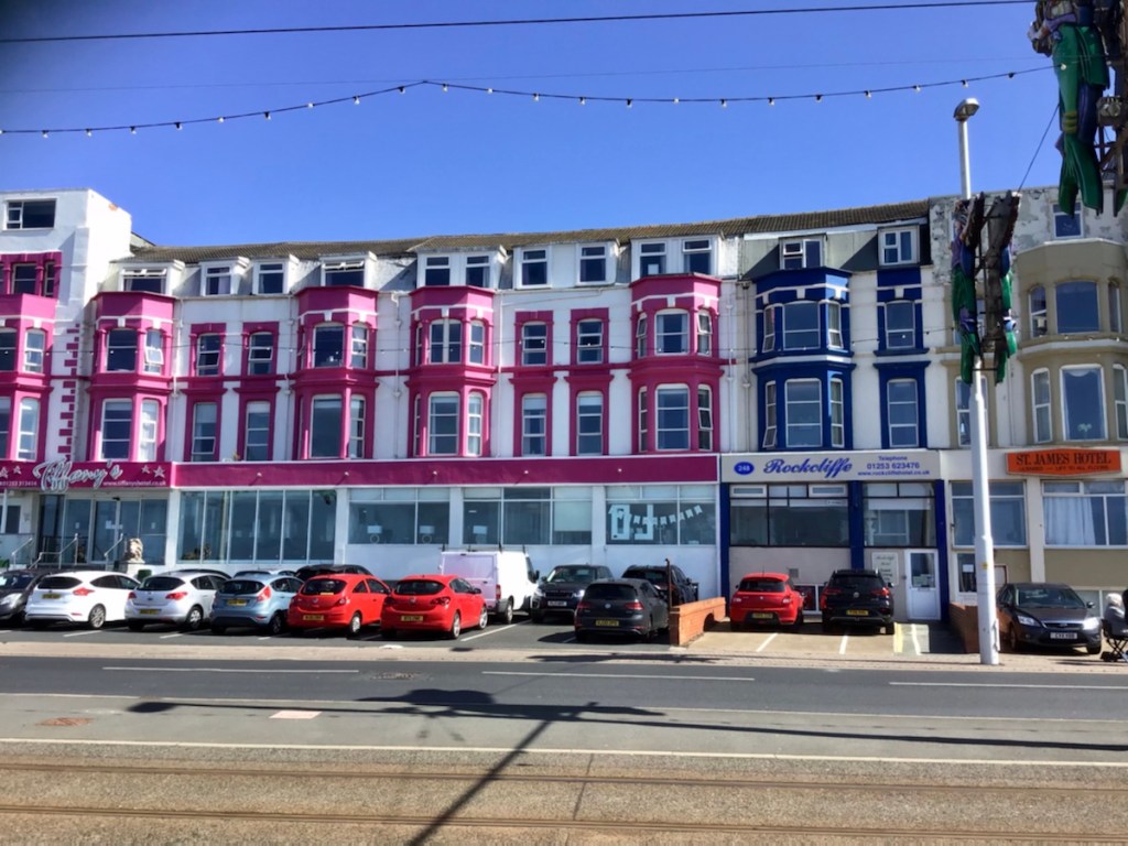 Forget about Romans, Vikings, Saxons and history, we’re in the seaside holiday town of Blackpool and I love it! We are staying at a very small hotel opposite the beach. The Rockcliffe. Looking at all the tiny hotels wedged in between the huge ones reminds me of Fawlty Towers.