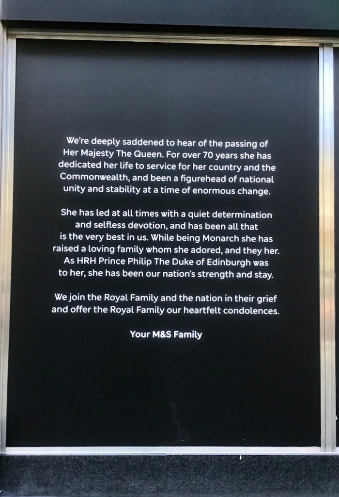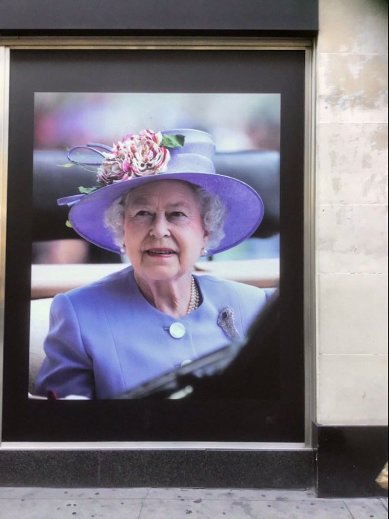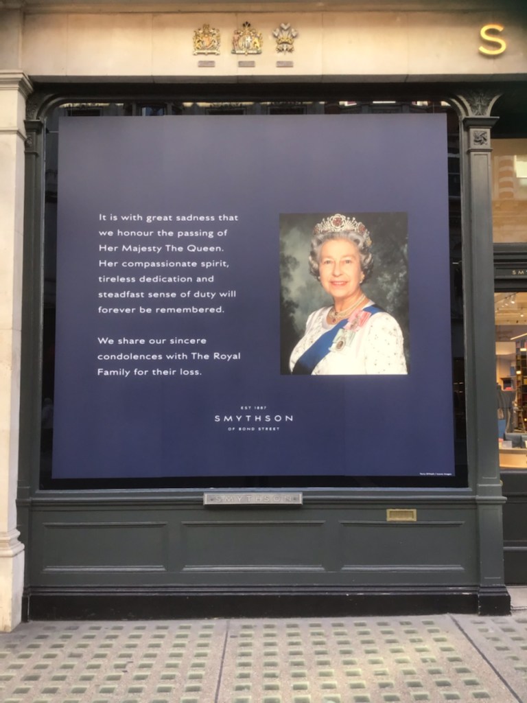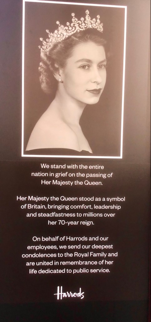 It was only chance that had us in London at this momentous time in our history. Thousands lined up for hours to pay their respects, thousands of others laid flowers in Green Park. Shops had signs, photos and messages of condolence. The mood in London has been sombre, but certainly not down. People have been polite, and going out of their way to be helpful.