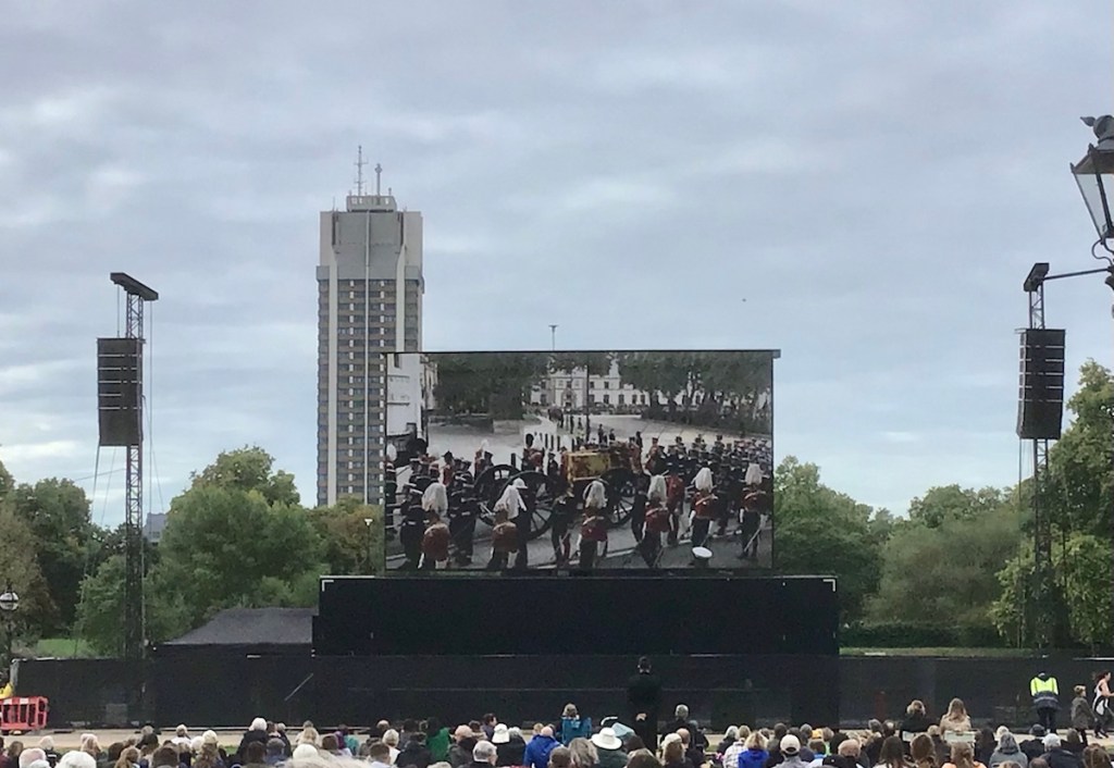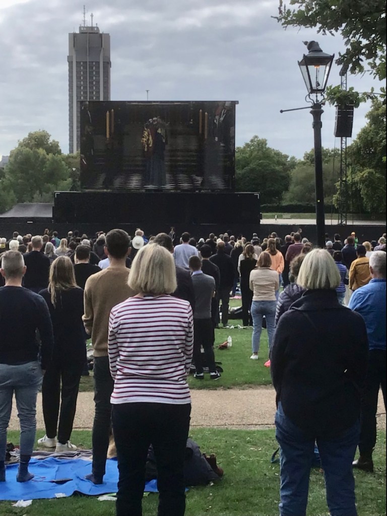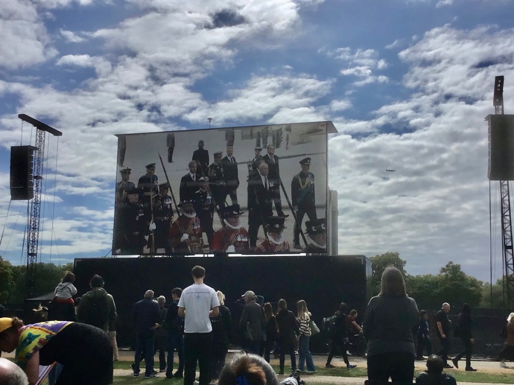 Today was a very sad day for the people of Britain. Their beloved Queen’s funeral was held. We joined hundreds of people in Hyde Park to watch the Funeral and procession on the big screen. Knowing, that being a shortie, there was little chance of seeing the actual procession along the chosen route.