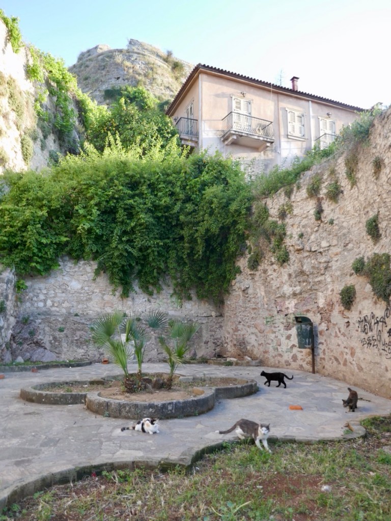 Walking up and down the weathered steps has been a good workout. Sitting looking across the town at Palamidi Fortress has not encouraged us to climb up to the top!