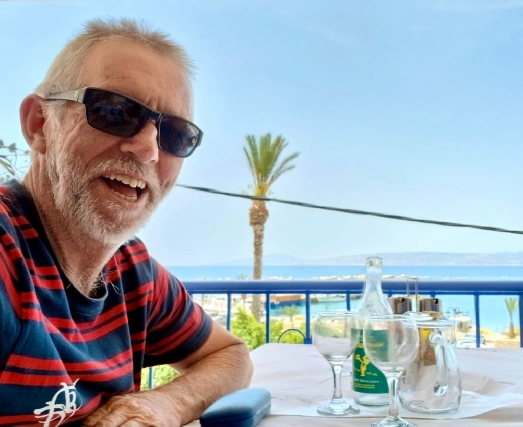 We walked down to the harbour and along a path to the pebbly beach. Now there are a number of resorts with chairs and umbrellas for hire. Nothing like that when Lionel was here last, but he recognised his accommodation (Selena’s) which had been the last row of buildings…not anymore!