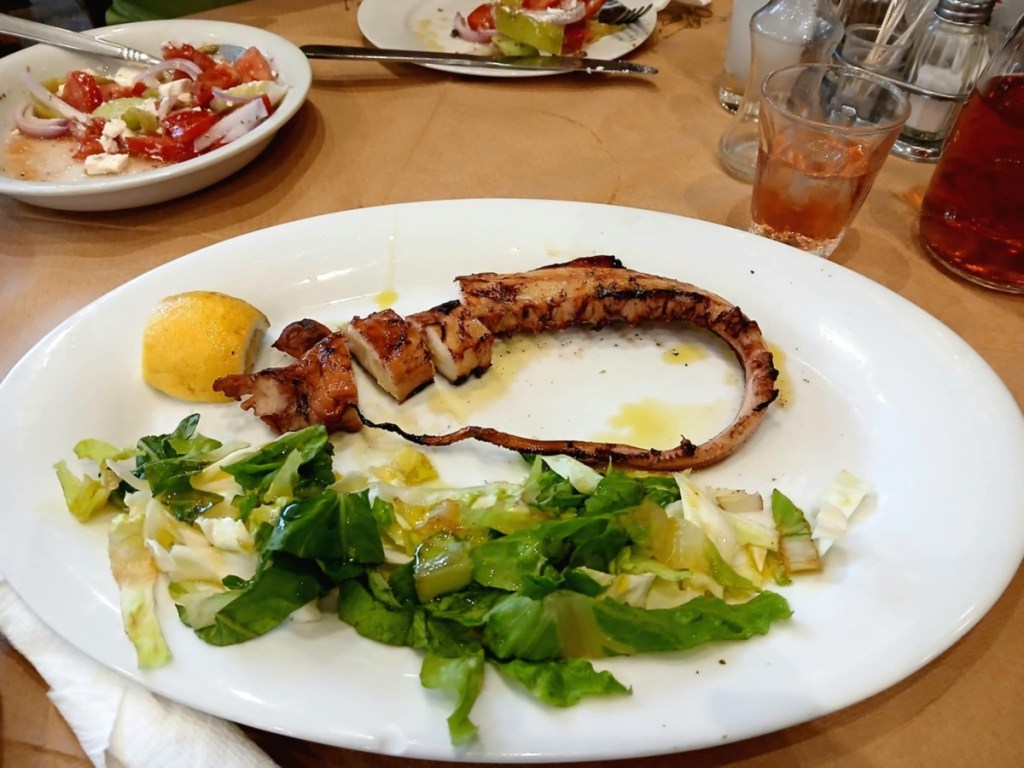 We’ve had some very tasty dinners in Greece, and it took quite a while but I finally had octopus. It was ok, but one of my favourites was the veggie plate we had last night. (We have had enough souvlaki, skewers, lamb chops and assorted meats to last us a while).